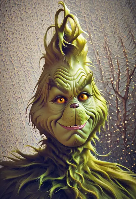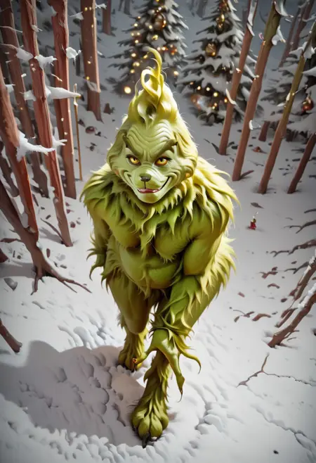 grinch01, green furry skin, yellow eyes, pointed ears, thick fur, wrinkled face, wide nose, flat nostrils, defined cheek lines, sharp brow ridges, vertical forehead wrinkles, large round belly, long fingers, clawed nails, hairy chest, fur-covered arms, tufted chin, fur-covered legs, digitigrade legs, messy fur texture, yellow sclera, green irises, sharp slit pupils, glowing green irises, slanted eyes, sharp outer eye corners, thick eyelids