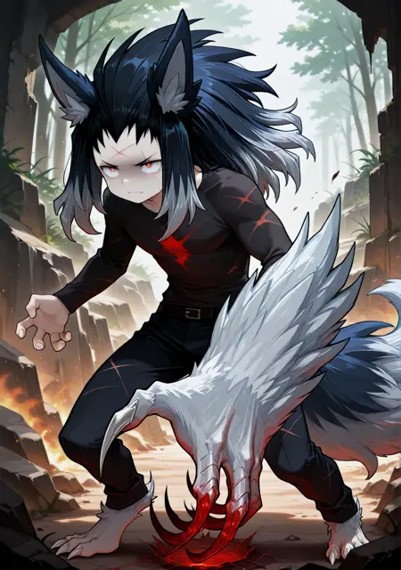 wolfroland, animal ears, black hair, wolf ears, scar on forehead, pale skin, wolf boy, tails, claws, glowing_eyes, necktie