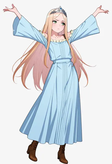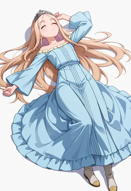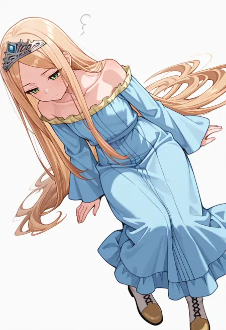 collarbone,blue dress, off-shoulder dress, long dress,sleeves past fingers, tiara,high heels,