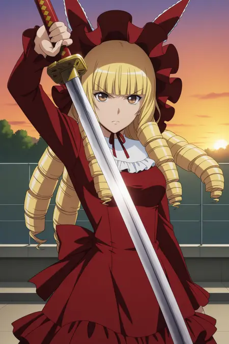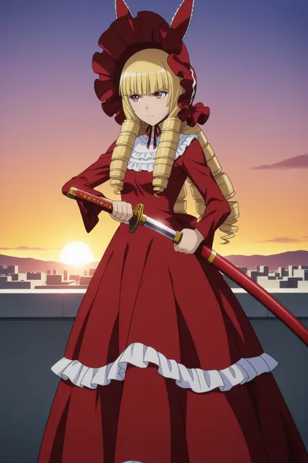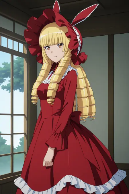 minamoto kurou yoshitsune, long hair, blonde hair, drill hair, tri tails, drill sidelocks, bonnet, hat with ears, chin strap, blunt bangs, brown eyes, long sleeves, red dress, frilled dress, long dress, layered dress, back bow