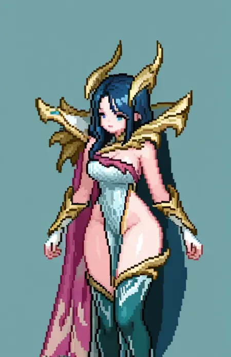 fae_dradon_ashe, blue eyes, pink lips,long dark blue hair, dragon-like golden horns, mint green scaly dress,green thigh-high boots, golden armor details, leaf-like shoulder armor,pink-purple flowing cape, gold trim,