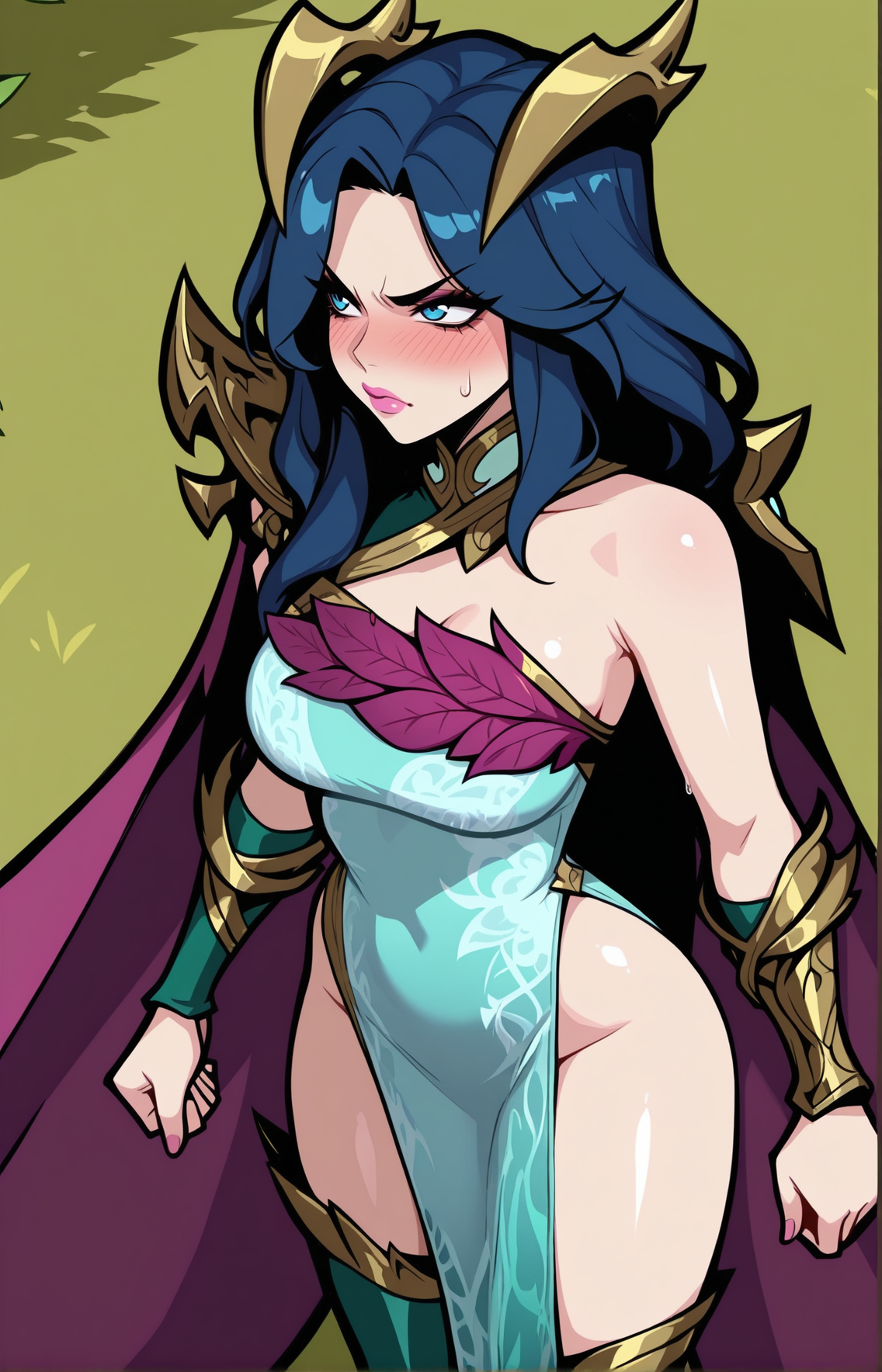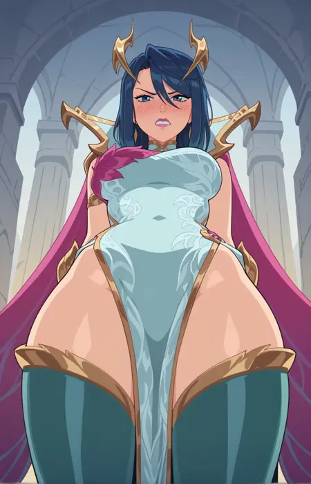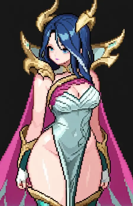 fae_dradon_ashe, 푸른 눈, 핑크색 입술, 길고 짙은 파란색 머리, 드래곤처럼 생긴 금색 뿔, 민트 그린 비늘 무늬 드레스, 녹색 허벅지 길이 부츠, 금색 갑옷 디테일, 잎 모양 어깨 갑옷, 분홍-보라색 흐르는 망토, 금장식,