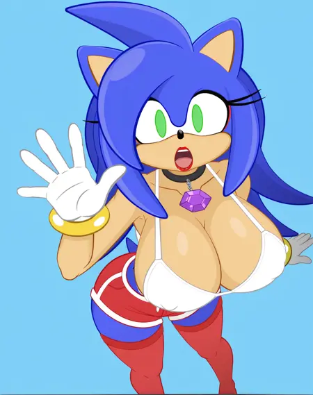 >Sonic - sanic_the_hedgehog, solo, 1girl, furry, female, hedgehog, skin, blue fur, green eyes, no pupils, blue hair, long hair, red lipstick, black nose,