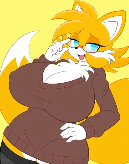 >Tails - tails_the_fox, solo, 1girl, furry, female, fox, yellow fur, white fur, two-tone fur,Light Blue Eyes, no pupils, Two Tails, White Tipped Tail, medium hair, chest tuft, black nose,