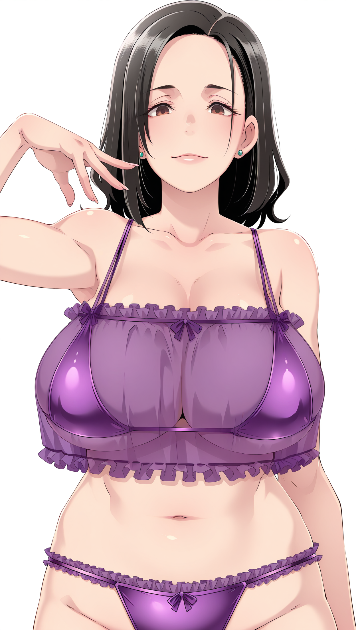 动漫上色, 杰作, 最佳画质, 惊艳画质, butcha-u风格, 1个女孩, 成熟女性, 中等长度头发, (深黑色头发:1.2), 分开的刘海, 完美眼睛, 棕色眼睛, 大胸, 耳钉, purplerhapsody, 透明衣物, 透明, 吊带背心, 比基尼, 紫色比基尼, 内裤, 紫色内裤, 单人, 姿势, 站立, 看着观众, 正面视角, ((((白色背景, 简单背景))))