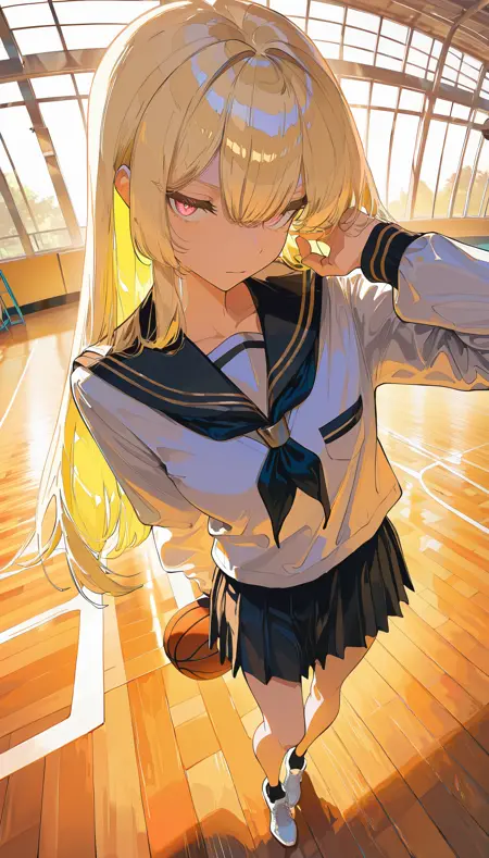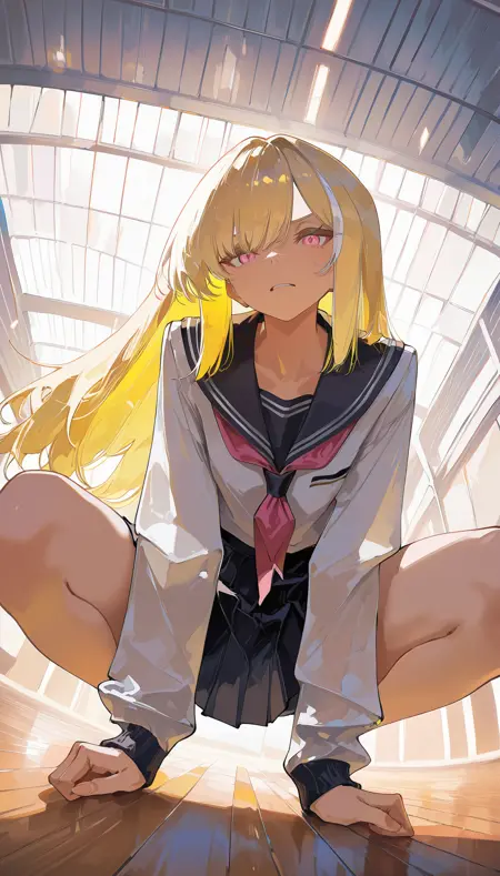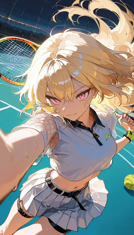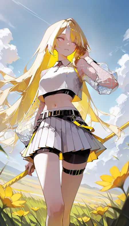 - ブロンドヘア、マルチカラーの髪、白くハイライトされた髪、ピンクの目、白いクロップトップ、メッシュの袖、テニススカート、白いスカート、ベルト、スカート下のタイトな黒いショートパンツ、白いハイカットスニーカー、太ももストラップ、メッシュ素材の服、お腹の露出、へそ露出