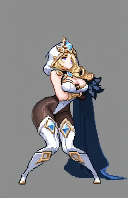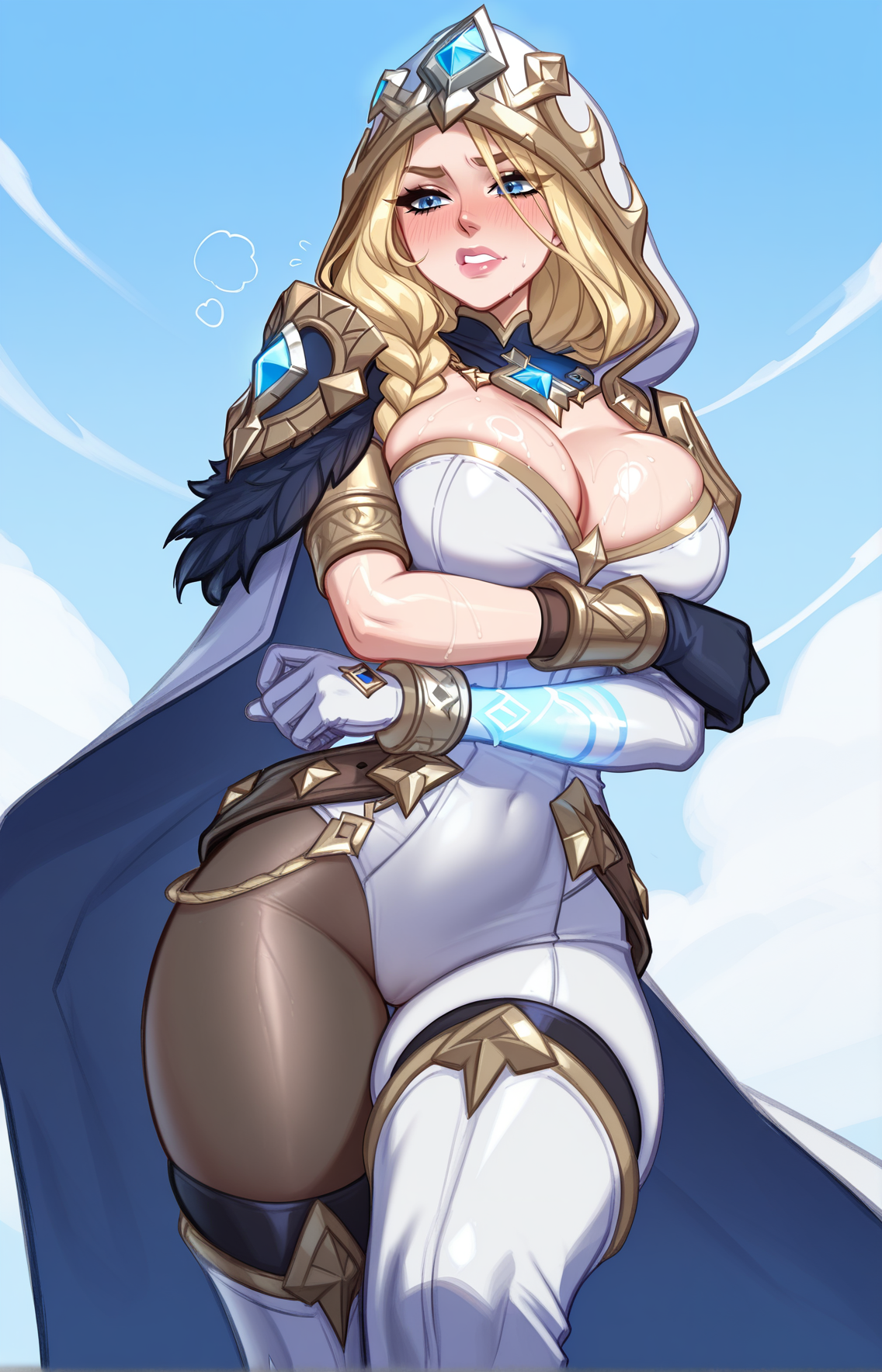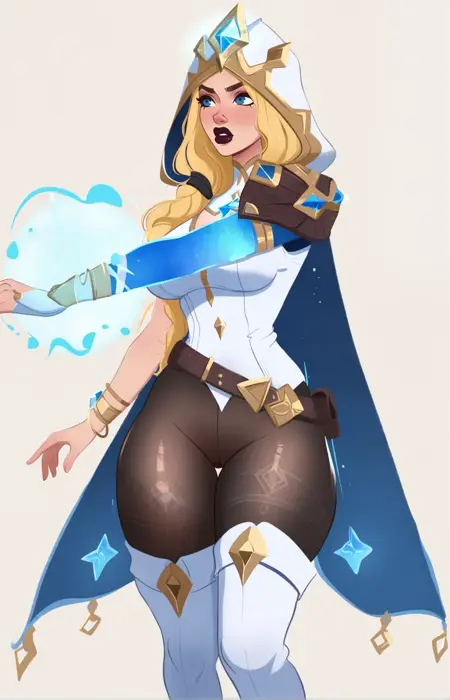 Freljord_Ashe, blonde hair, blue eyes, white hooded cloak, gold trim, golden crown, white and gold bodysuit, single sleeve, golden arm guards, black pantyhose, white gloves, gold bracelets, blue tattos, white thigh-high boots,