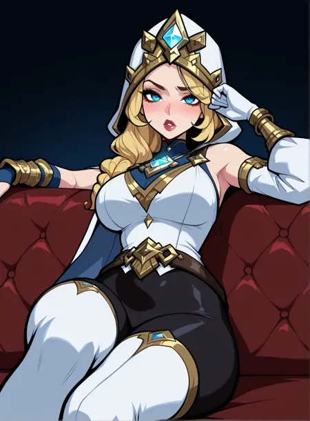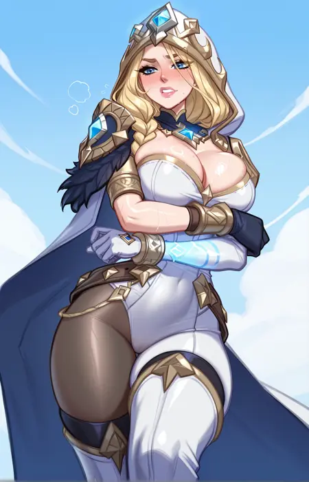 Freljord_Ashe,金色头发,蓝色眼睛,白色带帽斗篷,金色镶边,金色王冠,白金紧身衣,单袖,金色臂甲,黑色丝袜,白色手套,金色手镯,蓝色纹身,白色及膝长靴,