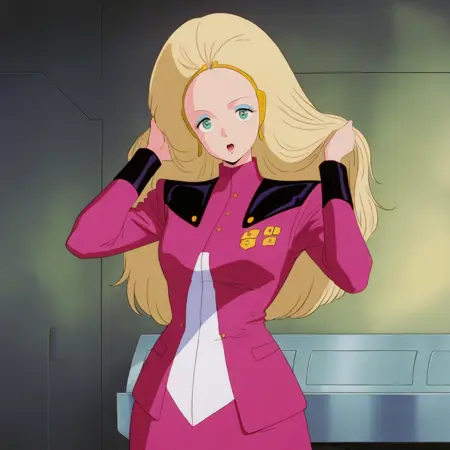 quwasan olibee, blonde hair, olibee headgear, long hair, green eyes, olibee pink uniform, pink dress skirt, eyeshadow, solo