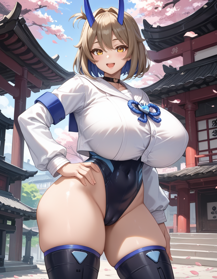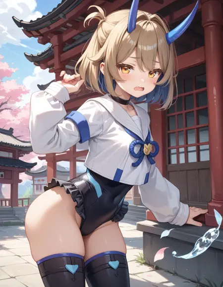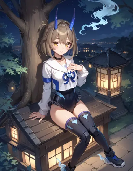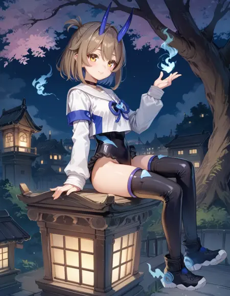 タグ(服):青い鬼の角、白いセラフク、黒いスニーカー、黒い thighhighs、黒いハイレグレオタード、黒いチョーカー、青い幽霊火、