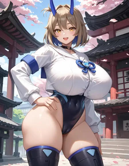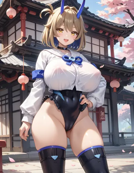 Tags (clothes): blue oni horn, white serafuku, black sneakers, black thighhighs, black highleg leotard, black choker, blue ghost fire,