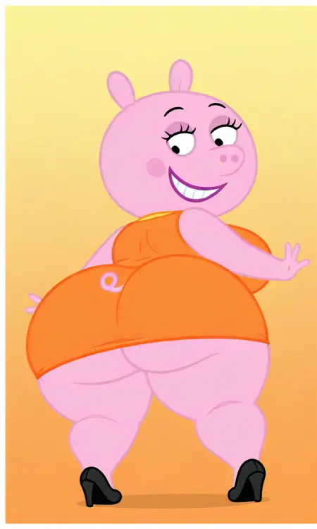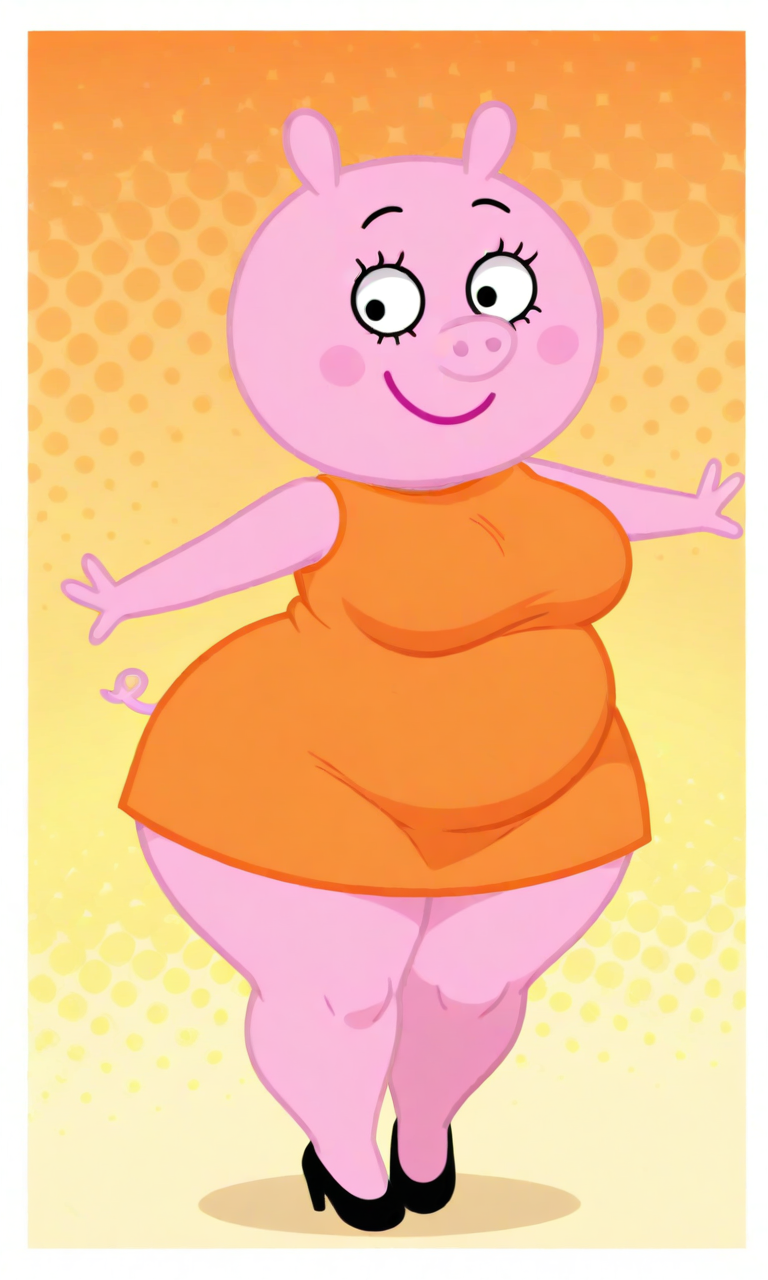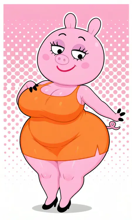 タグ: Mommy_pig, ピッグ, ピンクの体, 3本の指, 黒い目, ピッグの尾, ブラッシュステッカー, オレンジのドレス, 黒いハイヒール