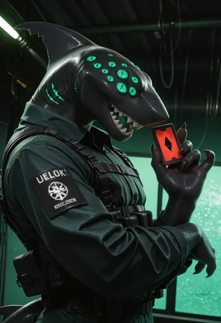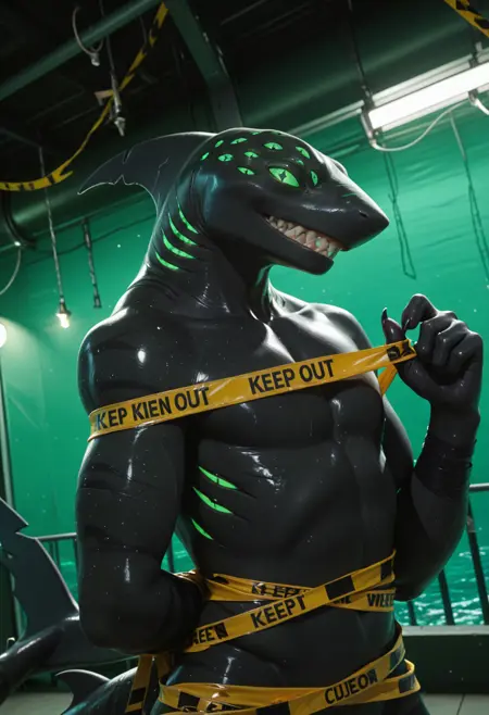 eyef3station_pr3ssure, shark, marine, multi eyes, furry, solo, tail, sharp white teeth, male focus, 1boy, black skin, claws, gills, eyes on body, green eyes