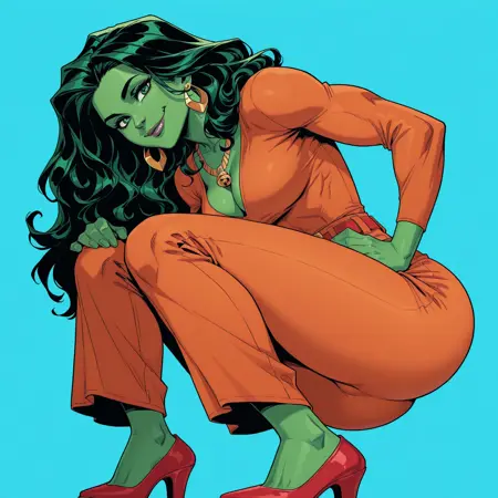 | トレーニングワード | 1girl, solo, She-Hulk, Green hair, long hair, green eyes, green lips, colored skin, green-skinned female, gold earrings, orange shirt, long sleeves, deep neckline, v-neck, cleavage, gold necklace, red belt, gold buckle, orange pants, bell bottom pants, red heels,コピーしました! |