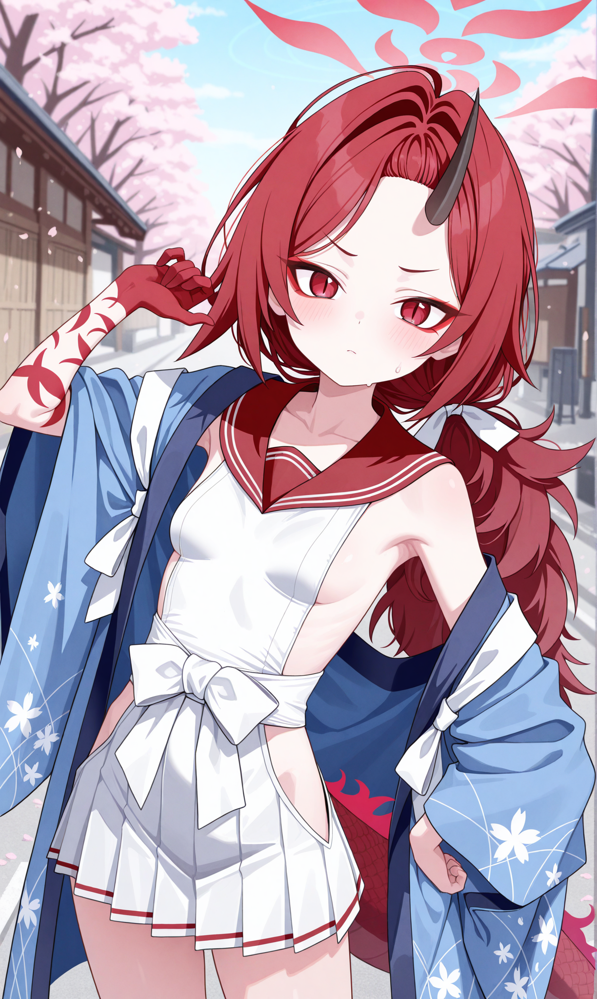 japanese clothes, white shirt, sleeveless shirt, sideless shirt, red serafuku, white bow, pleated skirt, white skirt, blue haori, wide sleeves, hip vent