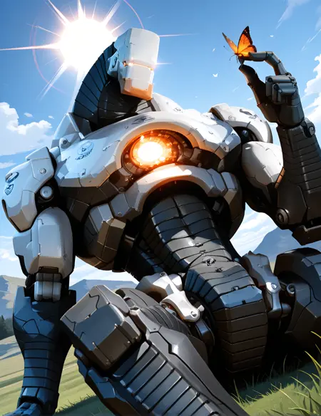 金属灰与黑色外表面,黑色关节,高大身材,圆润的上胸部位可见机械细节,肌肉发达的腹部,黑色细长无接缝的柔韧手臂,形似缆绳。头部呈棱角状,发出橙色光芒的眼睛,带关节的脚部,胸部有白色胸肌纹理,