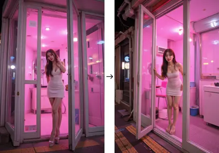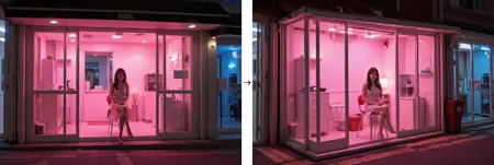 Inside the {color} storefronts is {color} lit,The interior is relatively bright. Out side the pink stoefront,the surrounding area is dimly lit,