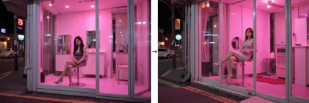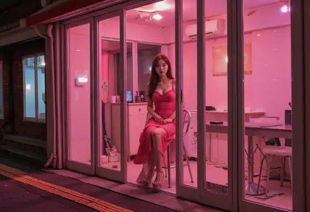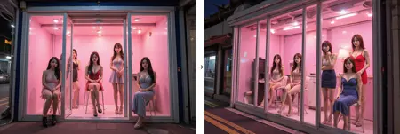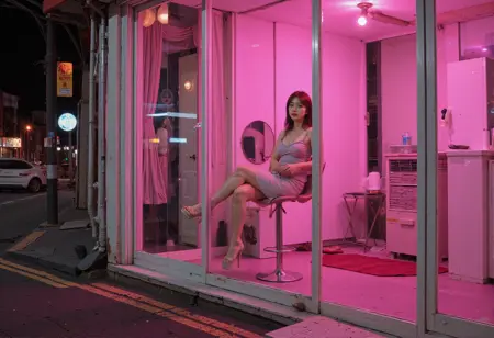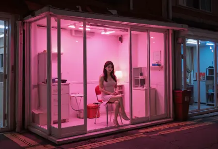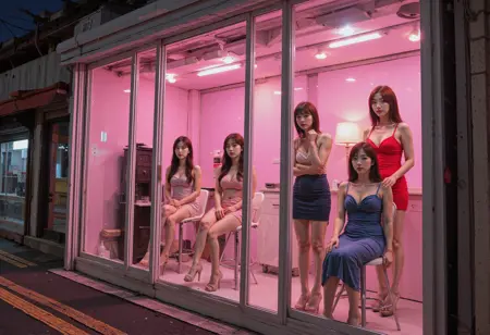 prostitution, girl inside a storefront, whore, girls and storefront's interioris are visible through its large glass windows, the storefront with large glass door and white frame, the storefront with glass display window,