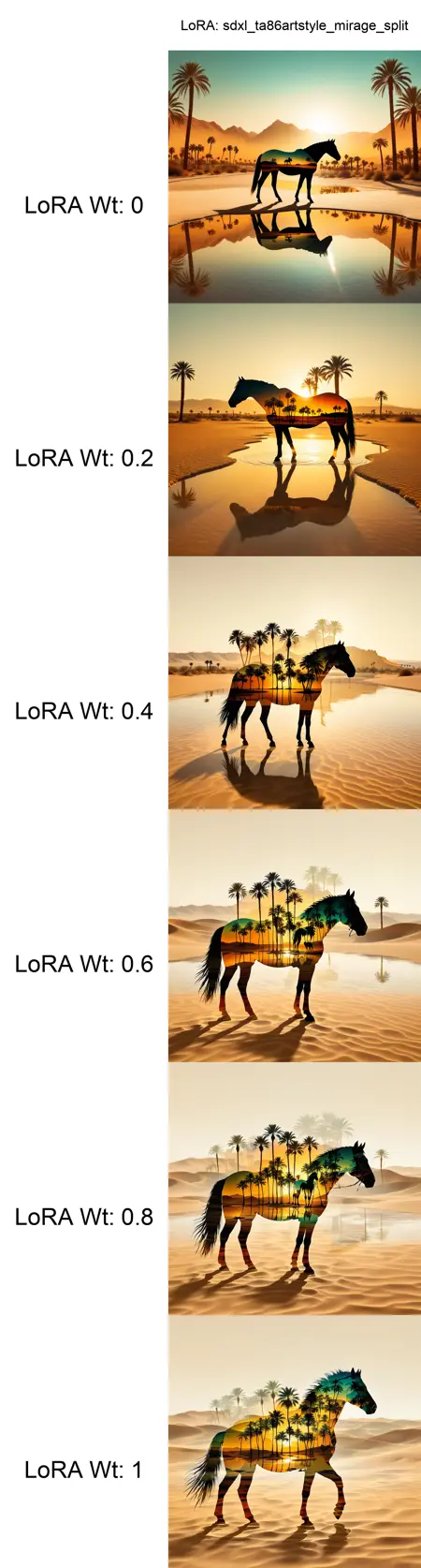 此 LoRA 将任何主体转化为形式与视觉的融合体。一种通过沙漠幻象 shimmer 透射的惊艳“双重曝光”效果——形状依然清晰明确,但其内部却孕育着另一个世界:景观、光影图案、纹理或场景,沿着主体轮廓弯曲、波动与流动。