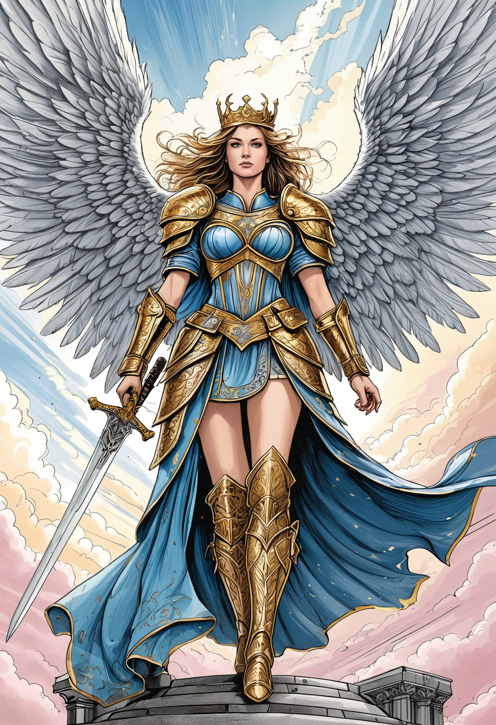 – 古代の神殿の壁から発見されたかのように描かれた、神話的または神聖なトーンを持つシーン