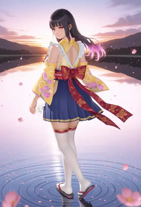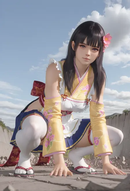 yellow short kimono, yellow detached sleeves, back cutout, white frilled apron, blue pleated skirt, hip vent, red obi, red back bow, white tabi thighhighs, black flip-flops,