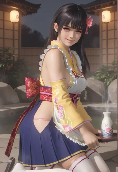 ofhospitablebeauty, yellow short kimono, back cutout, sideless kimono, yellow detached sleeves, white frilled apron, blue pleated skirt, hip vent, red obi, red back bow, white tabi thighhighs, black flip-flops,