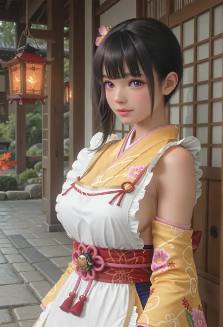 ofhospitablebeauty, yellow short kimono, back cutout, sideless kimono, yellow detached sleeves, white frilled apron, blue pleated skirt, hip vent, red obi, red back bow, white tabi thighhighs, black flip-flops,