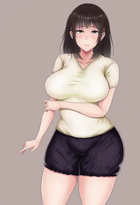 트리거 단어: c-eno, saki, 갈색 머리, 중간 길이 머리, 헤어클립, 녹색 눈, 큰 가슴, 성숙한 여성,