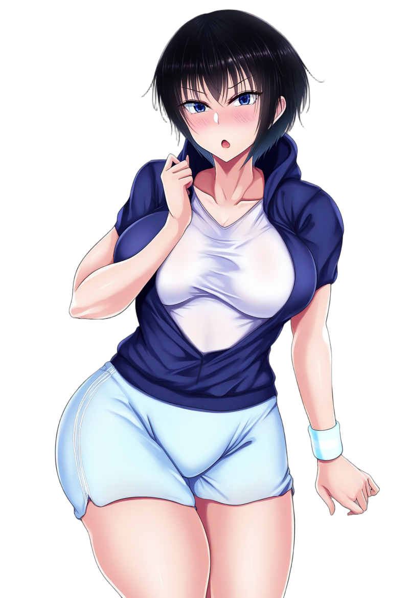 의상: 파란 후디, 흰 셔츠, 짧은 소매, 손목밴드, 연파랑 체육복 반바지,