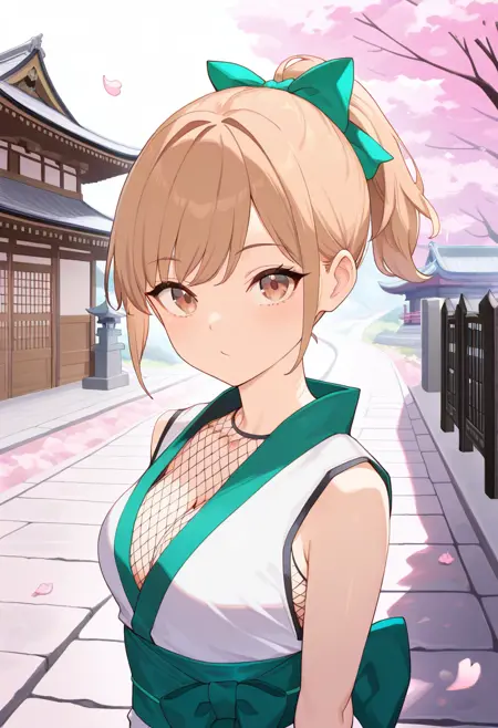 H1k4Ri, 1girl, brown eyes, short hair, ponytail, fishnets, japanese clothes, sandals, sleeveless kimono, green bow, hair bow, cleavage,