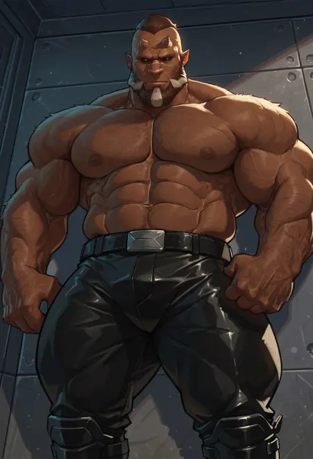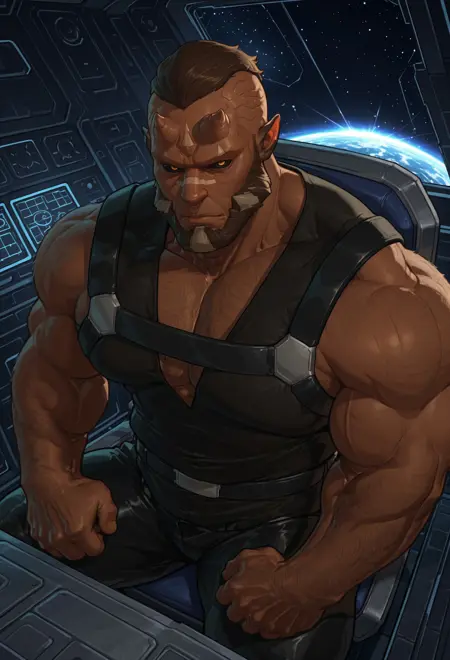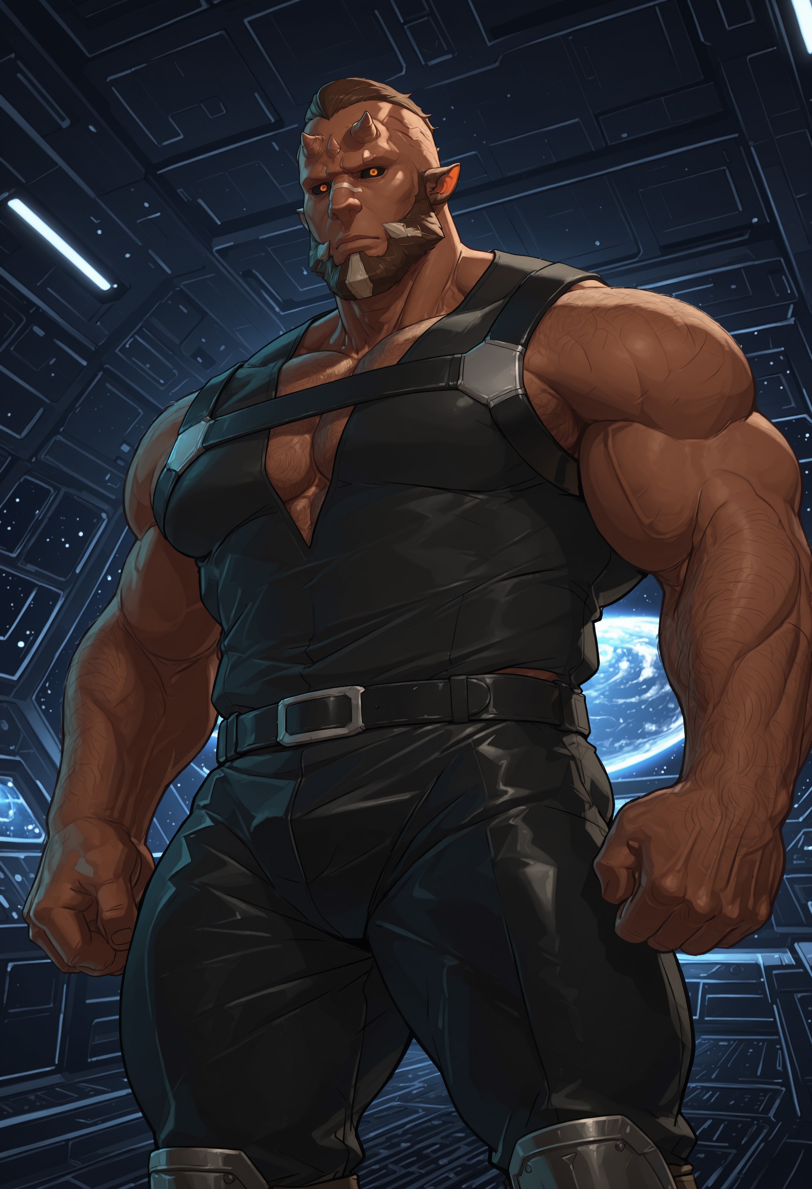 Kol, muscular, brown skin, hairy body, brown hair, alien ears, bald on sides of head, slicked back hair, black sclera, orange iris, white nose strip, white and brown striped beard, tight black v neck shirt, chest strap, black belt, black shiny pants, black leather fur boots, narrow eyes, no eyebrows, 3 forehead horns, chiseled nose, frowning
