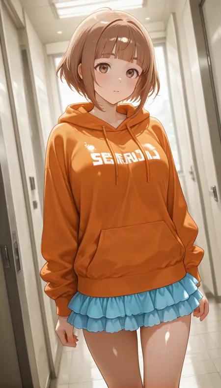 スカート、ロングスリーブ、フリル、フード、青いスカート、フード付きパーカー、フードを下ろした状態、フリル付きスカート、ドローコード、レイヤードスカート、オレンジのフード付きパーカー、ミニスカート、赤いフード付きパーカー、ミニスカート