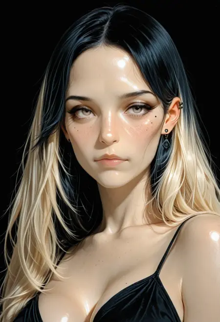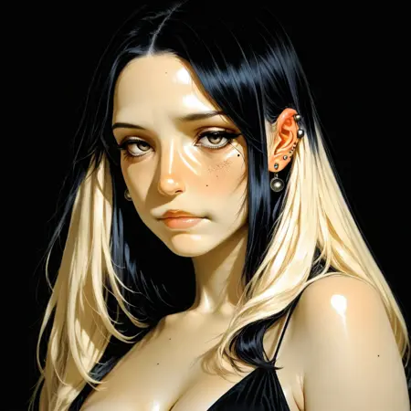 Multiple_piercings, long hair, multicolored hair, two-tone hair, black hair:1.2, blonde hair:0.8,