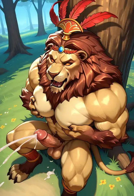 強化プロンプト: "lion, furry, tail, orange sclera, no pupils, glowing, muscular, masculine, large pectorals"