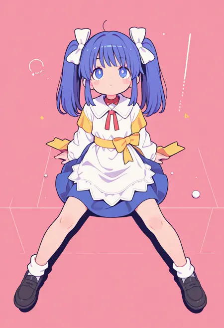 blue hair, twintail hair, white bow, sidelocks, blue eyes, white dress, white sleeve, yellow sleeve, layered sleeves, long sleeve, apron, yellow waist sash, blue skirt, red neck ribbon, black loafer,