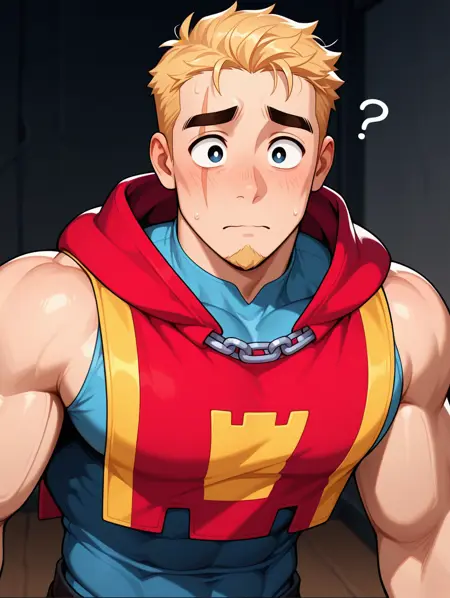 bsgrom, muscular male, bara, goatee, red hood, hood down, hood covering forehead, blue undershirt, sleeveless