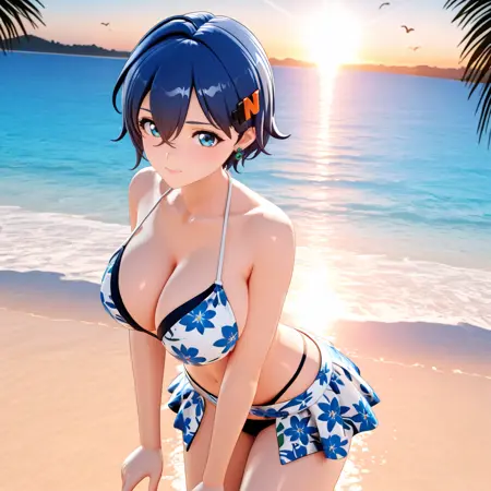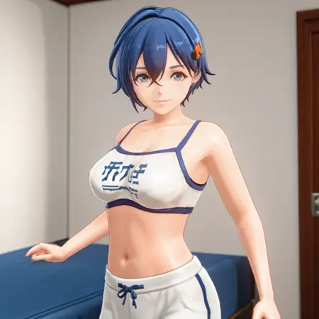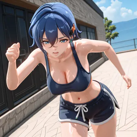 触发词:Belle, 1girl, 黑色过膝袜, 开襟外套, 黑色衬衫, 蓝发, 灰色裙子, 单侧过膝袜, 短发, 蓝眼, 长袖, 无指手套, 发丝遮眼, 刘海, 衣物敞开, 头饰, 珠宝, 不对称腿饰, 发夹, 背心, 牛仔构图, 3D