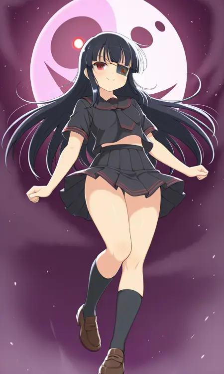 Mirai (Senran Kagura), long black hair, eyepatch, red eye, small breasts, thighs, Mirai_hebijo, school uniform, black sailor collar, black tie, black serafuku, black shirt, black pleated skirt, short sleeves, black legwear, brown loafers
