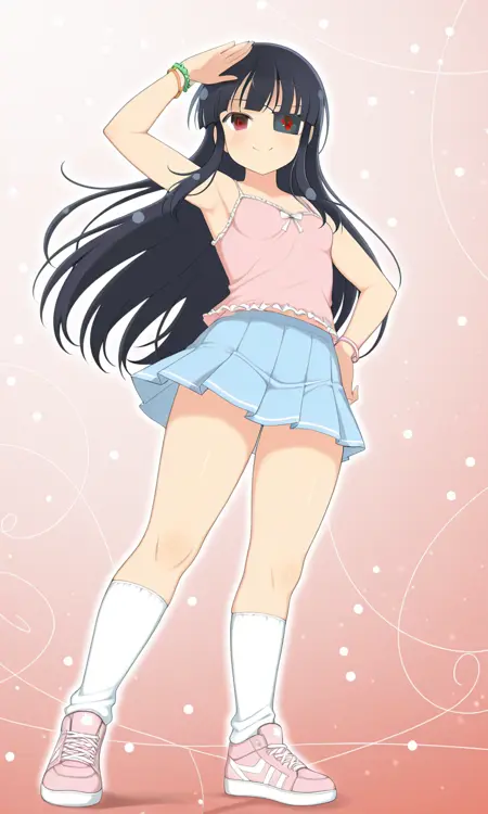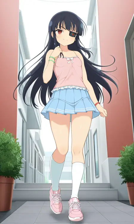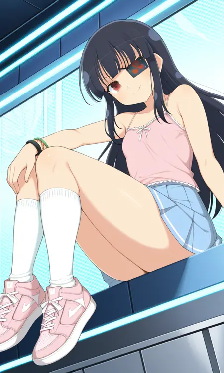 Mirai (Senran Kagura), long black hair, eyepatch, red eye, small breasts, thighs, Mirai_casual, pink tank top, inner camisole, bracelet, wristband, white kneesocks, blue pleated skirt, pink sneakers