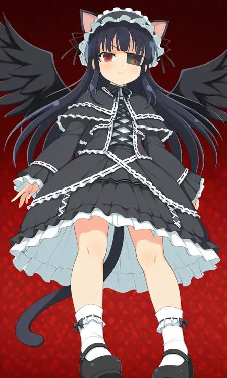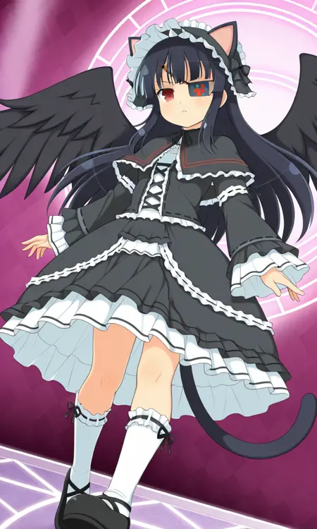 Mirai (Senran Kagura), long black hair, eyepatch, red eye, small breasts, Mirai_Shinobi, gothic lolita, lolita fashion, frilled hat with cat ears, dress, frills, capelet, long sleeves, black wings, white socks, black shoes, cat tail
