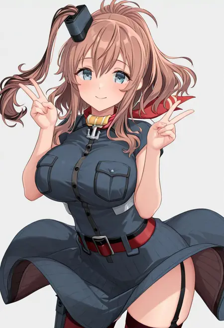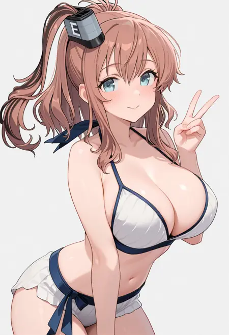 saratoga \(kancolle\), 1girl, 파란 눈, 갈색 머리, 높은 사이드 플랫테일, 눈 사이의 머리카락, 사이드록, 플랫테일, 사이드 플랫테일, 연기통 모양 머리 장식, 연기통, 큰 가슴,