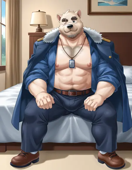 トリガーワード:sigvaldi、フワフワの青いコート、青いオープンシャツ、黒のデニムパンツ、白のタンクトップ、緑の男性用下着、多色の水着