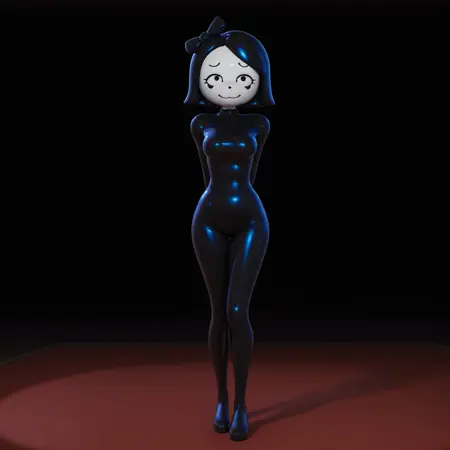 프롬프트: esmemimegirl, Female, black bodysuit, white Skin, curvy, eyelashes, eyeliner, glossy, latex, latex suit, makeup, mime, shiny skin, tight clothing, 1girl, Black hair, short hair, Black bow, black dress, black eyes, hair bow, black gloves, 3d