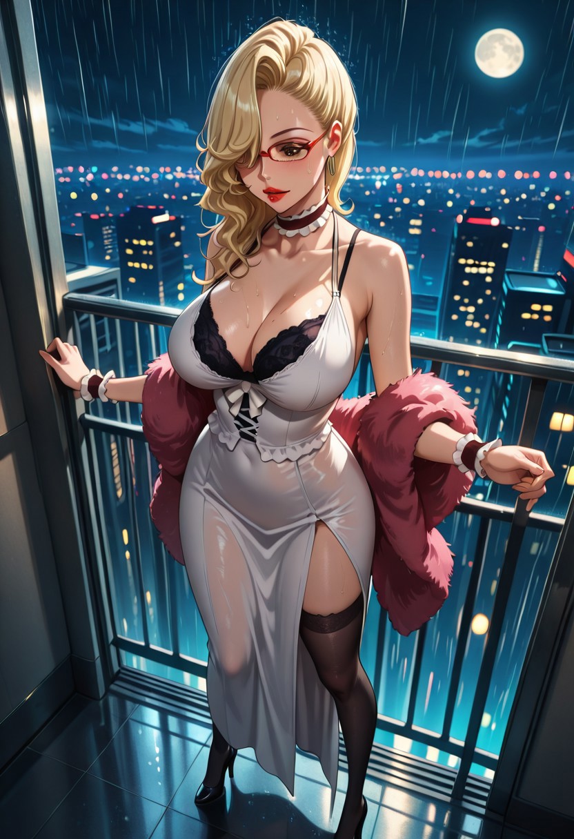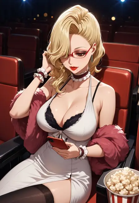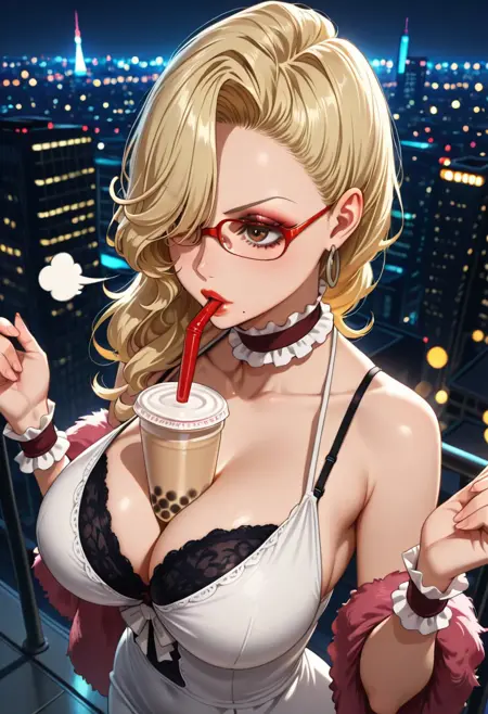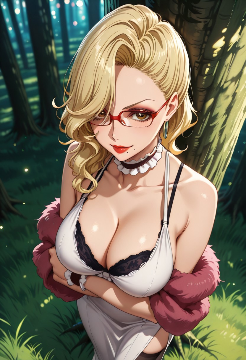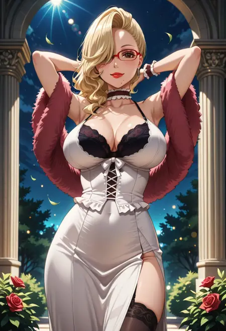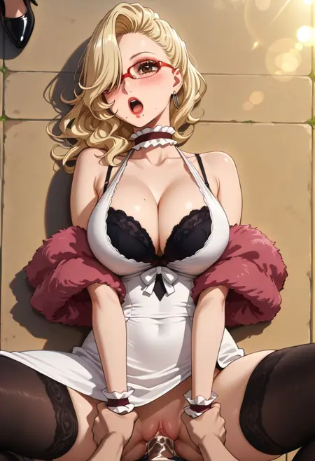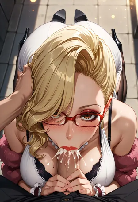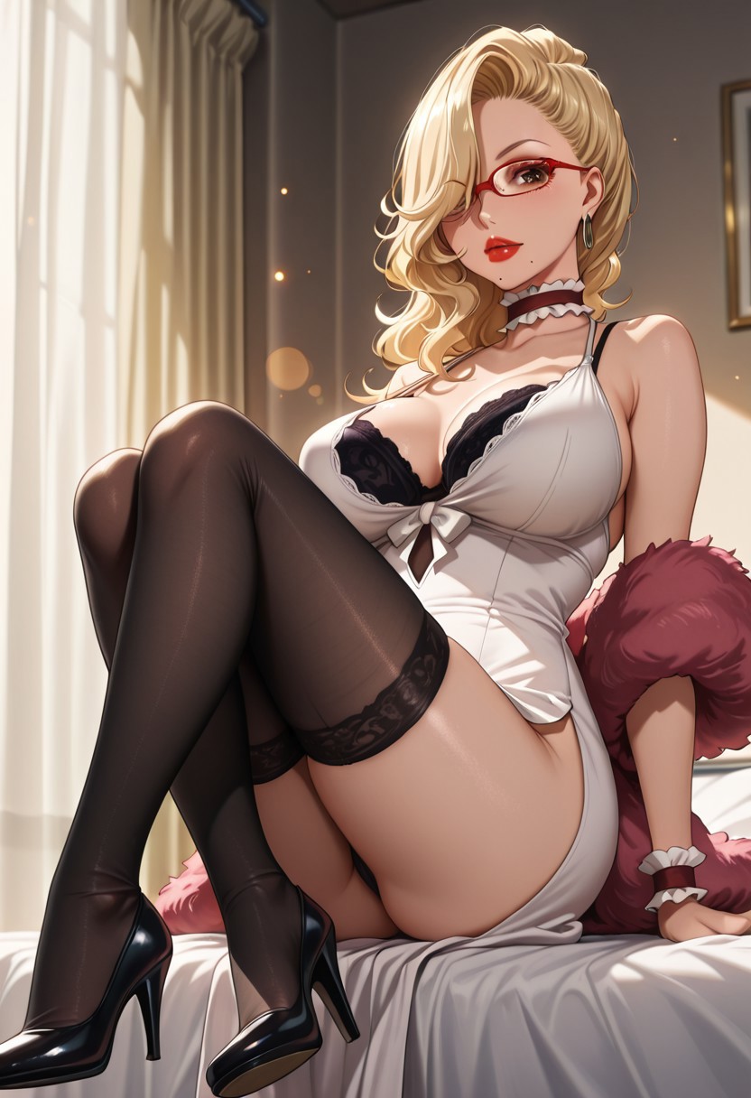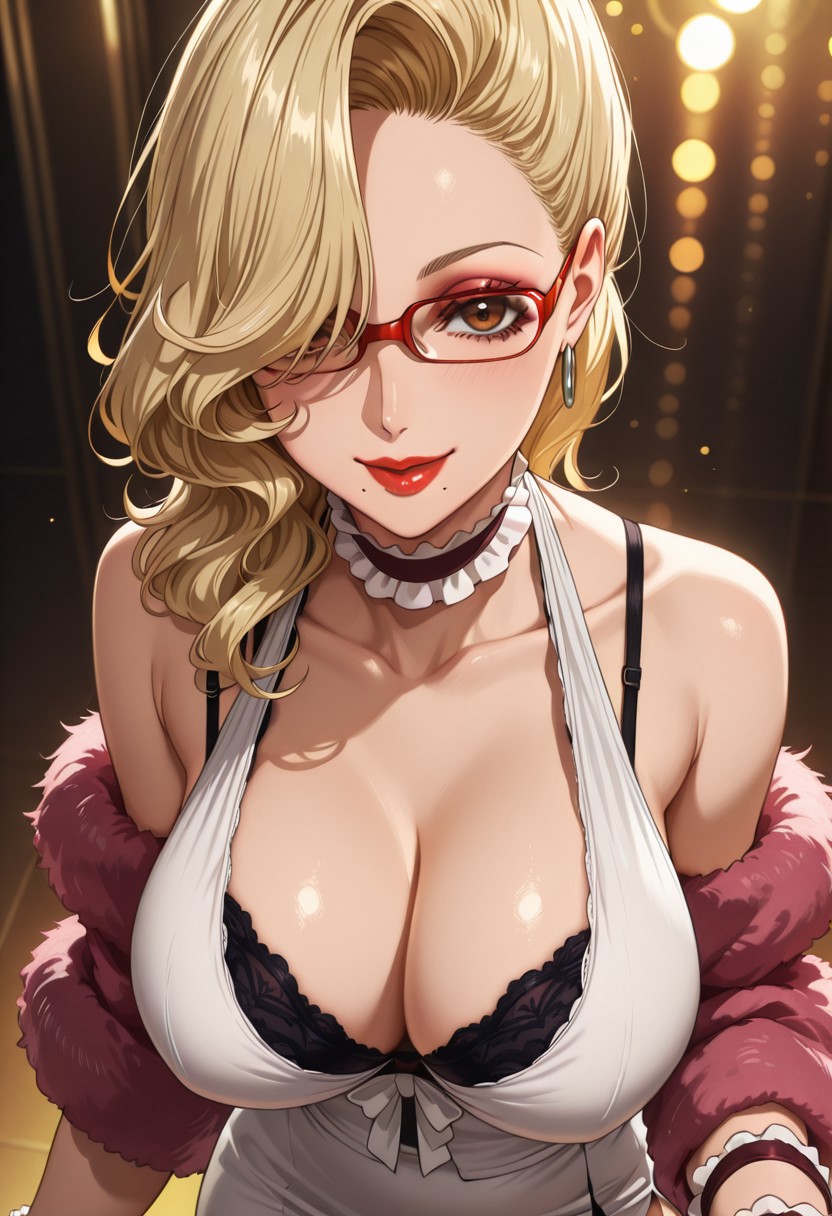 キャラクターの外見:金髪、ロングヘア、片方の目に髪がかかる、前髪、茶色の目、眼鏡、赤枠のメガネ、イヤリング、口の下のほくろ、化粧、赤い唇、大きな胸