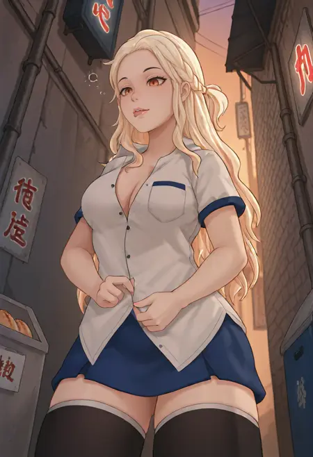 black thighhighs, blue skirt, white shirtを追加してください