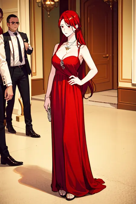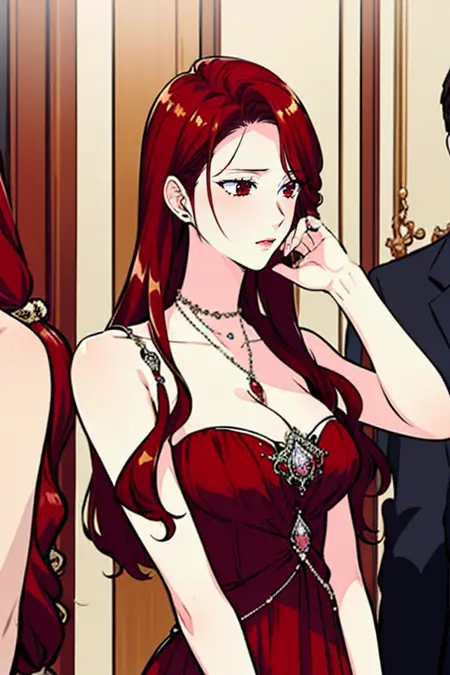 1girl, solo, solo focus, long hair, red hair, red eyes, bare shoulders, breasts, jewels, necklace, dress