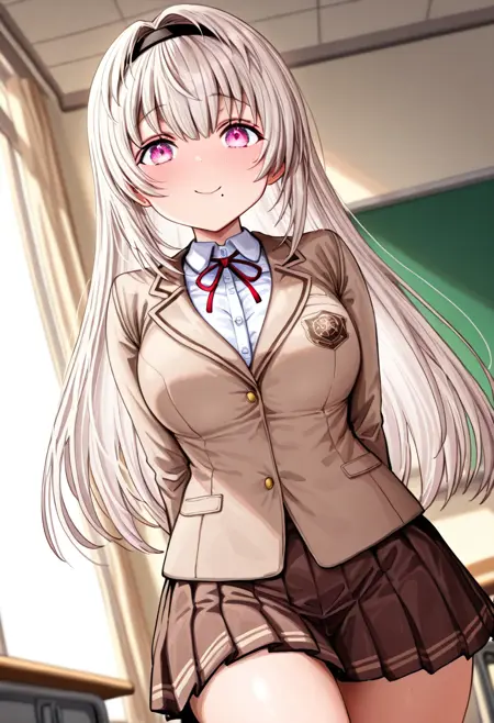 saho_color,1girl,solo,white hair,long hair,straight hair,mole under mouth,pink eyes,hair intakes,black hairband,school uniform, brown skirt,pleated skirt, collared shirt, blazer, brown jacket,