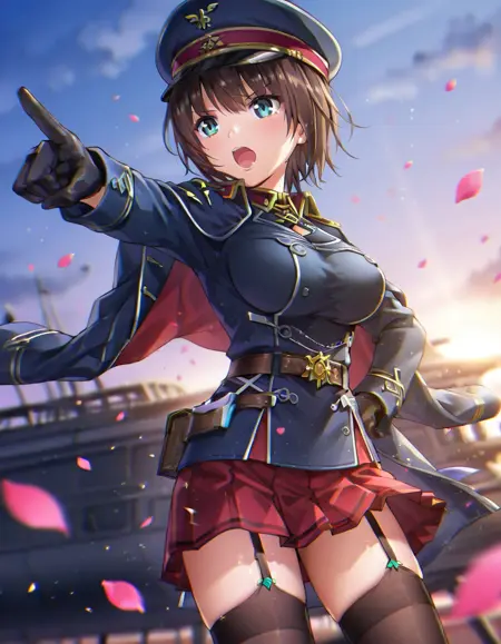 military uniform,hat,gloves,garter straps,thighhighs,red skirt,long sleeves,black gloves,pleated skirt,jacket,belt,miniskirt,