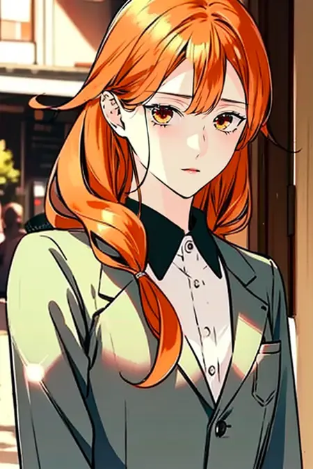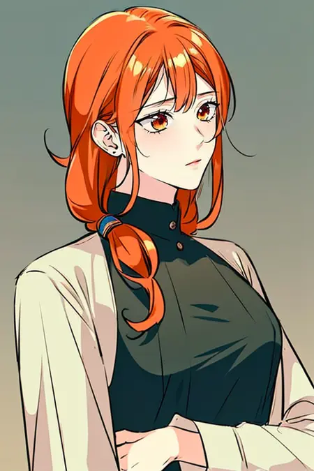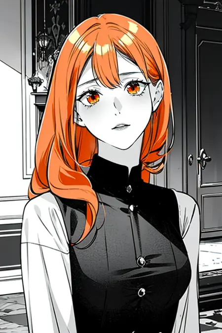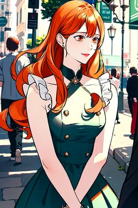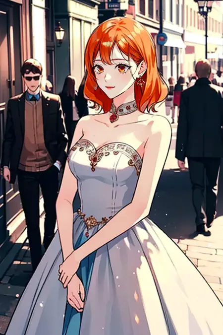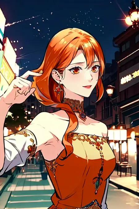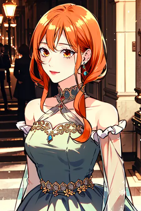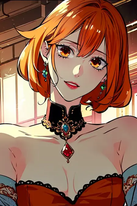1girl, solo, solo focus, long hair, orange hair, orange eyes, bare shoulders, breasts, jewels, necklace, dress, bangs