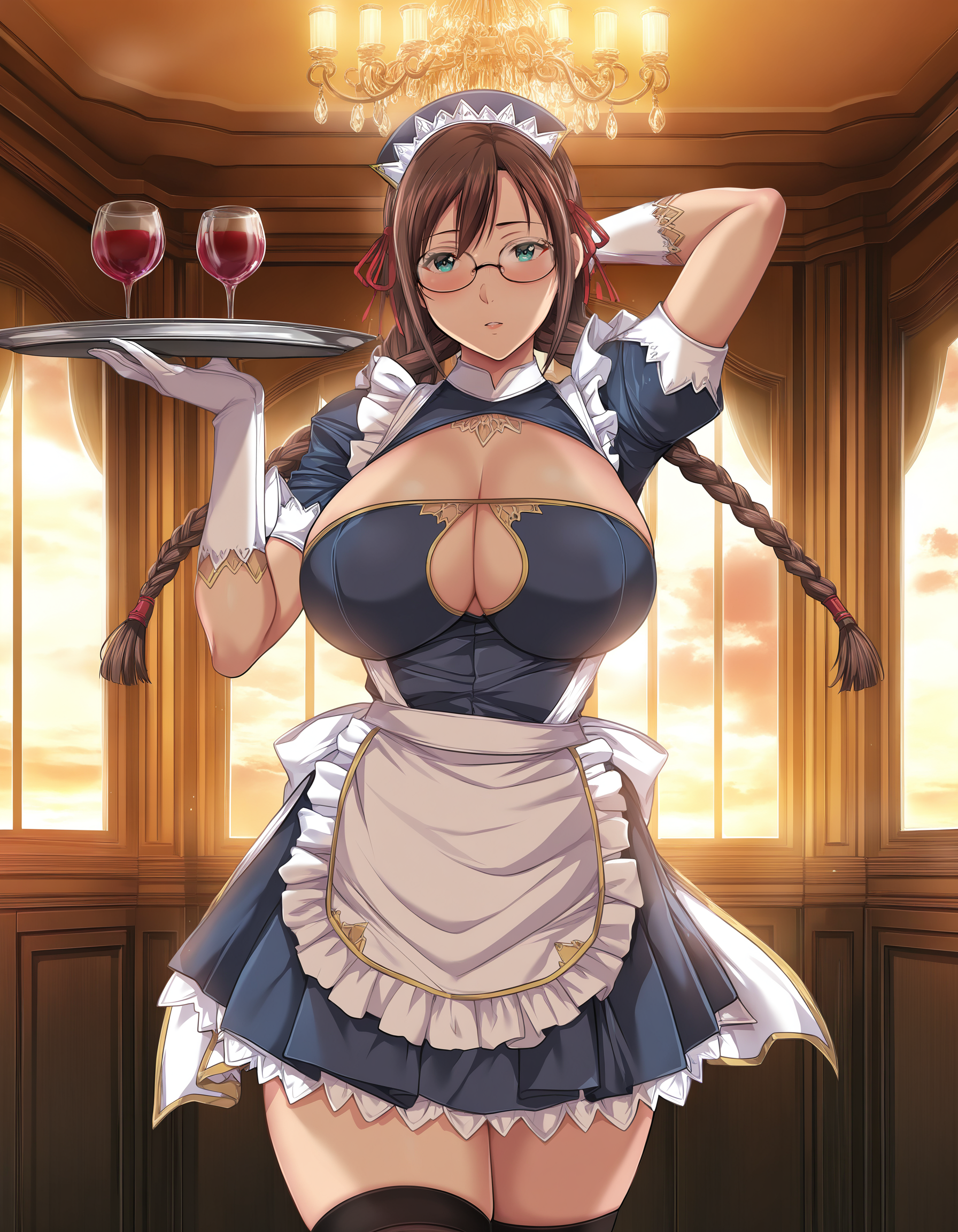 棕色头发,发辫,双马尾,长发,绿色眼睛,眼镜,发带,女仆头饰,